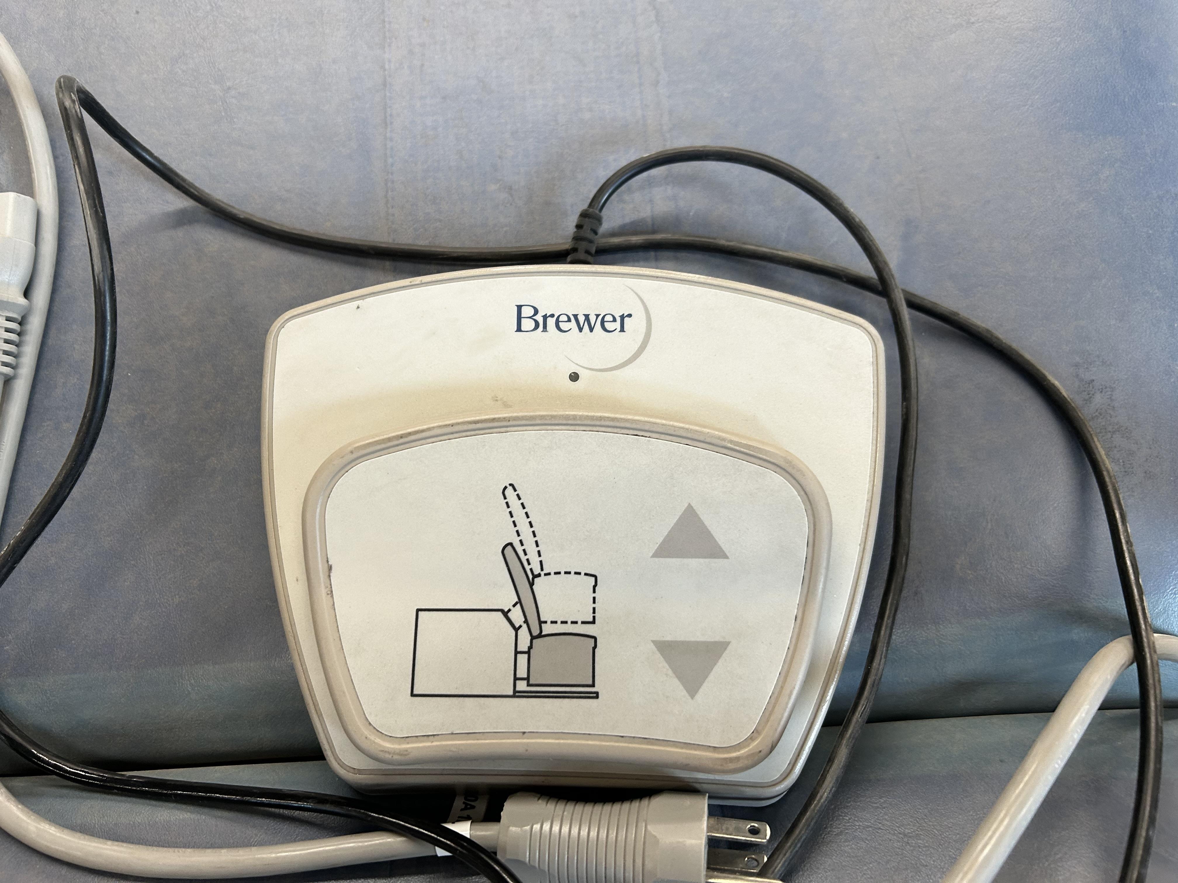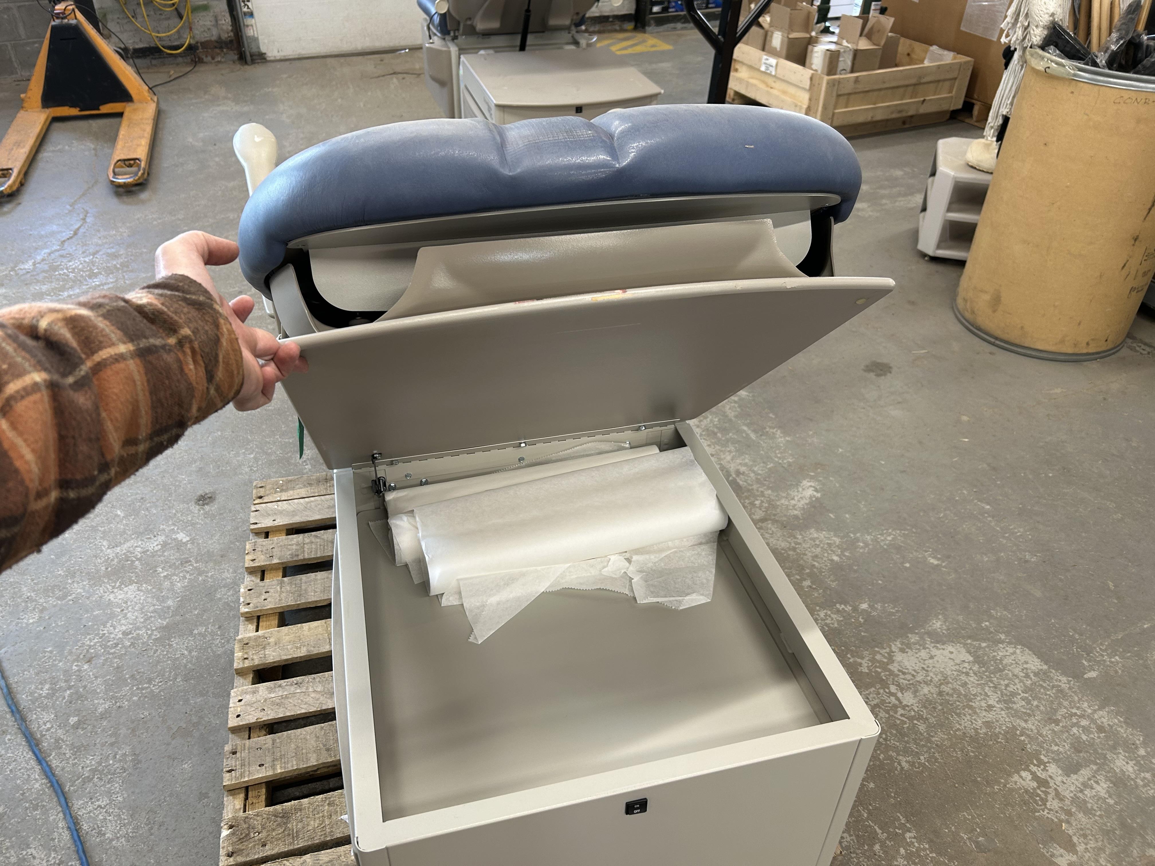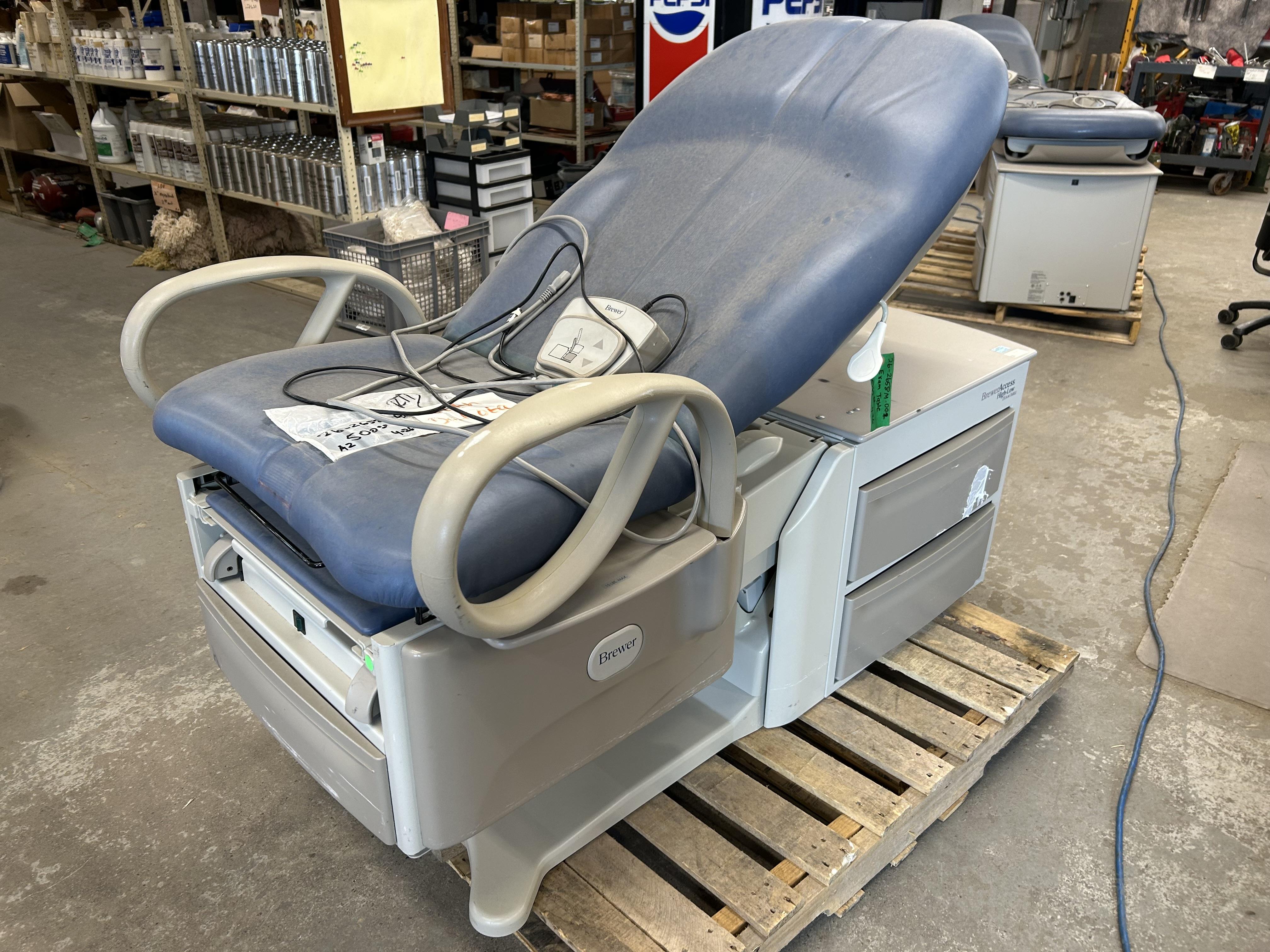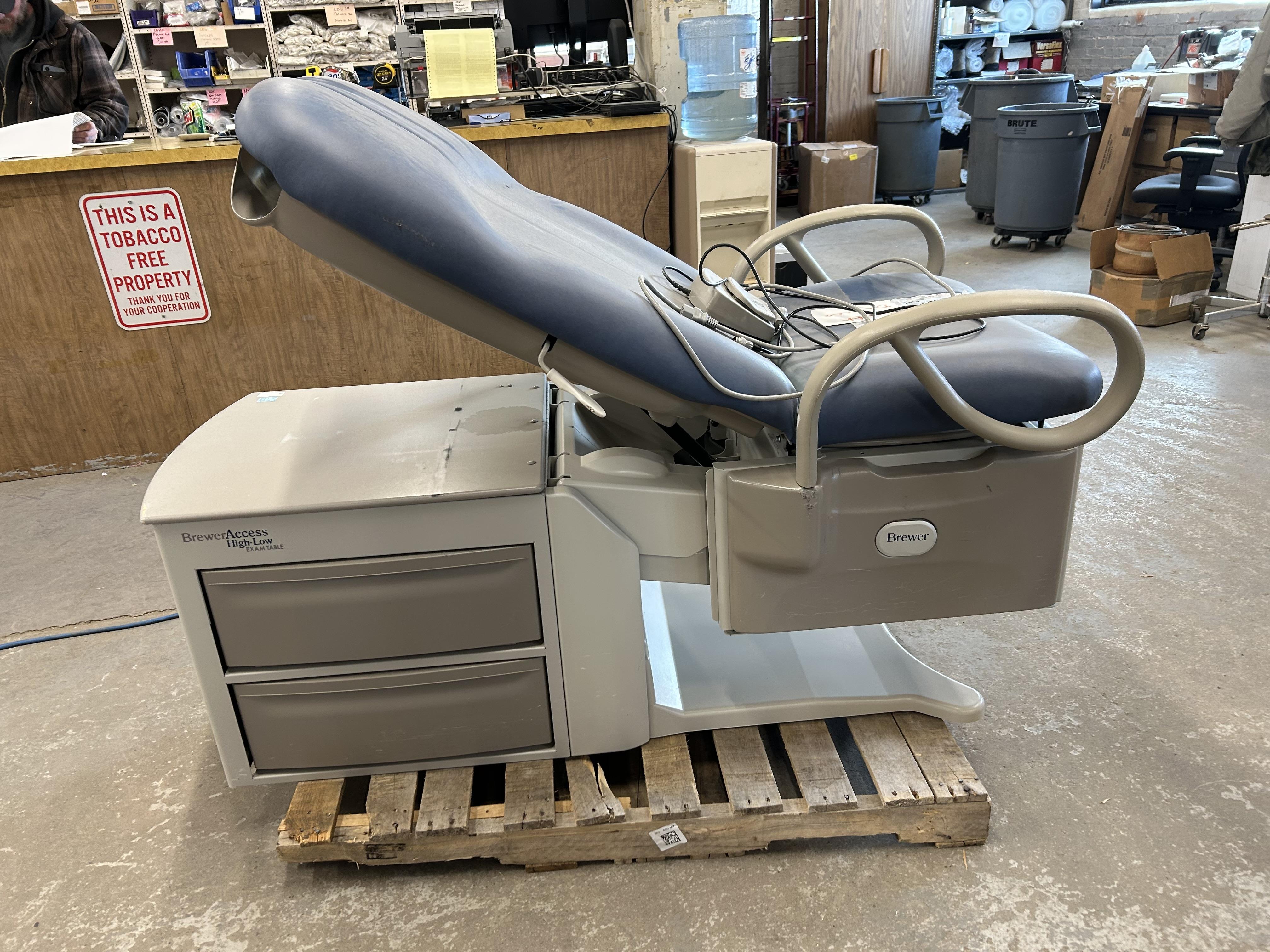 Brewer Access High-Low Exam Table, Model 6001. Side storage drawer components, with 60 Watt heater on front drawer. Adjustable seat, height 18", maximum height 37".