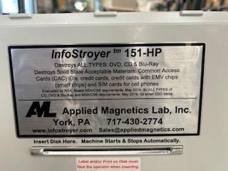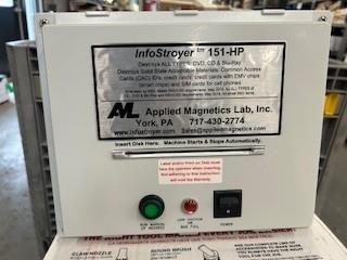 InfoStroyer 151 HP complete with ShopVac. This machine destroys digital media including: DVDs, CDs, Credit Cards, Sim Cards, Chipped Credit Cards, IDs and more. New.