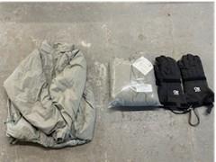 Cold weather gear including: PolarTech fleece pullover jacket and pants. Long Johns in regular and fire-proof. Cold weather stocking hats, neck gators, mittens, and parka ranging from $1.00 to $20.00