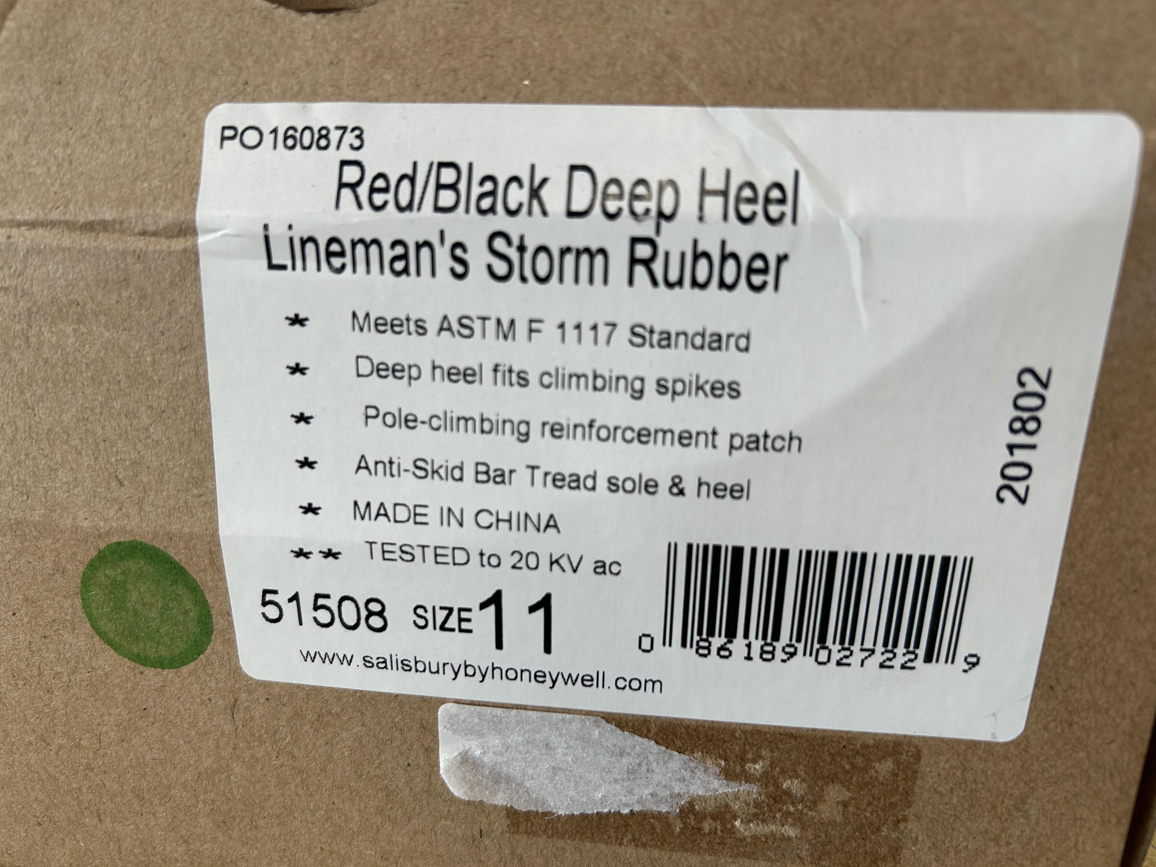 Salisbury Lineman's Slip-On Overshoe. Red/Black rubber tested to 20kV AC. Deep heel, fits climb spikes, Anti-skid. Brand new, available in sizes 11, 12, 13, 16.
