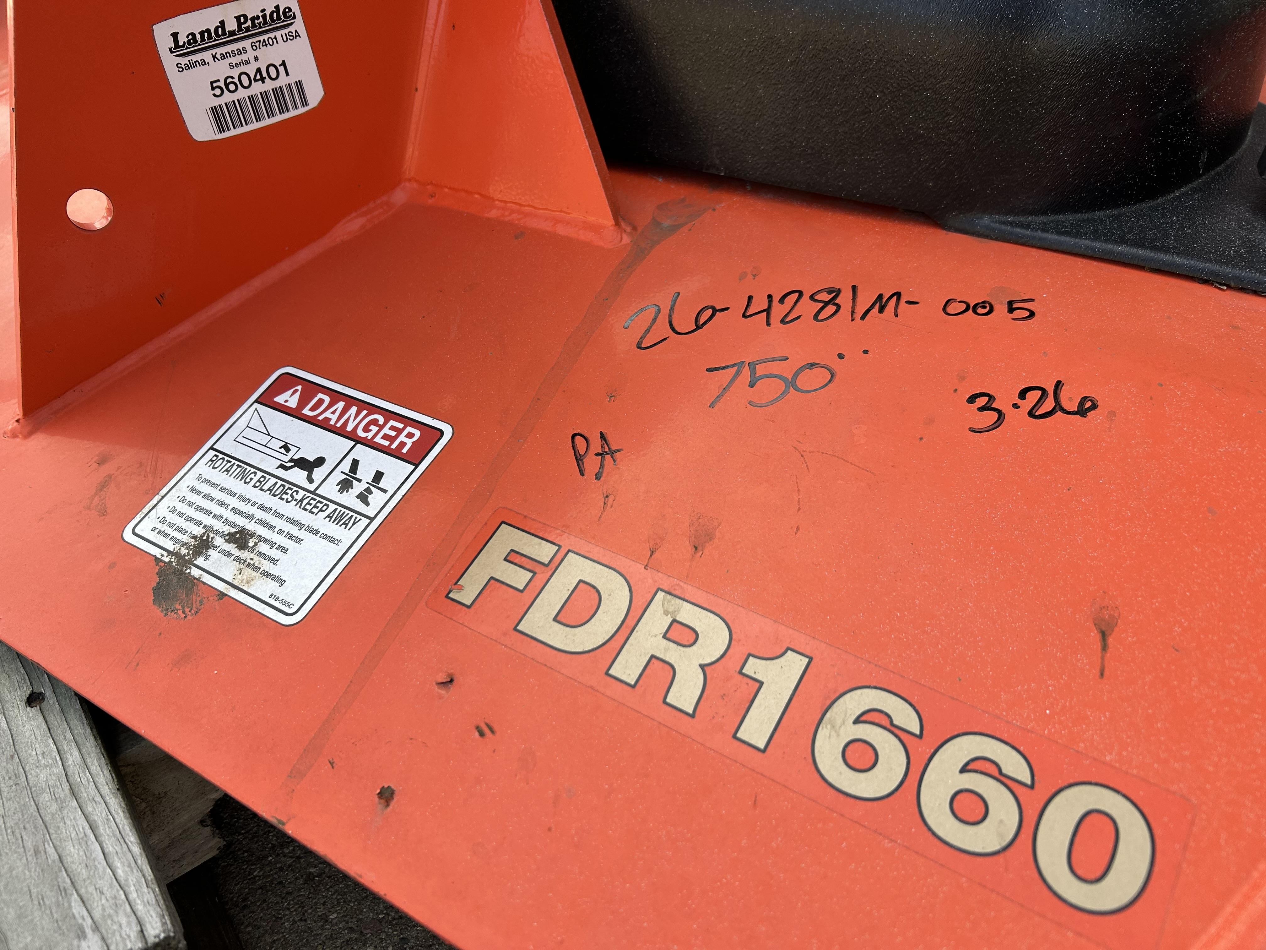 Land Pride FDR 1660 finish mower. 5' deck width, 3-point hook up. Complete unit.